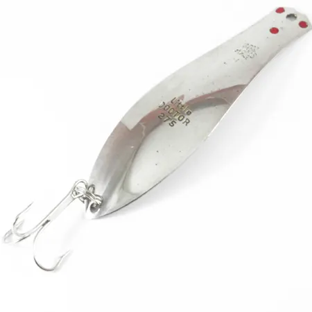 Con un peso di 3/5 oz (16g), questa specifica variante "Thin" del Little Doctor è stata progettata per la traina, dove un profilo più leggero e idrodinamico è preferito rispetto ai modelli da lancio più pesanti. La finitura in nichel lucido è accentuata da tre distinti punti rossi posizionati vicino all'occhiello di aggancio, un elemento di design distintivo della Prescott Spinner Company di Prescott, Wisconsin. Con una lunghezza di 3 1/2" (9 cm), la faccia dell'ondulante è chiaramente punzonata con la designazione del modello "Little DOCTOR 27S" insieme all'origine del produttore. Questo esemplare è in condizioni 5/5, mantenendo la sua superficie brillante e riflettente e l'ancoretta originale color argento. La struttura presenta un anellino spaccato in coda, che assicura che l'hardware rimanga saldo durante le lunghe sessioni di traina. Prodotto negli USA, l'esca rappresenta la semplicità funzionale dell'attrezzatura vintage di metà secolo, utilizzando un corpo affusolato per raggiungere la profondità desiderata senza eccessivo ingombro. Il lato inferiore è rifinito nello stesso nichel lucido, fornendo bagliori costanti da più angolazioni.