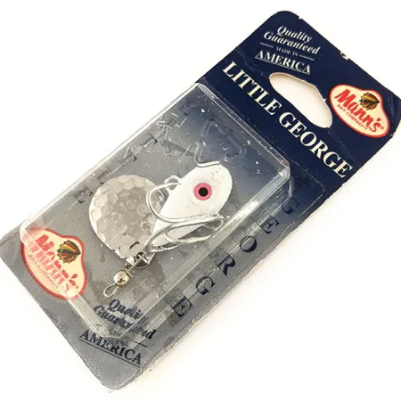 La finitura Bianco / Nichel Martellato identifica questo tail spinner da 4 cm (1 1/2"), un pezzo di storia della pesca ben conservato della Mann's Bait Company. Con un peso di 12 g (2/5 oz), il Little George con corpo in piombo è progettato per la versatilità, capace di essere pescato a qualsiasi profondità, dalla superficie fino al fondo. Questo specifico esemplare riporta il codice prodotto interno 12184 e presenta un caratteristico dettaglio dell'occhio rosa visibile sul corpo bianco, come indicato sulla confezione vintage WP4.