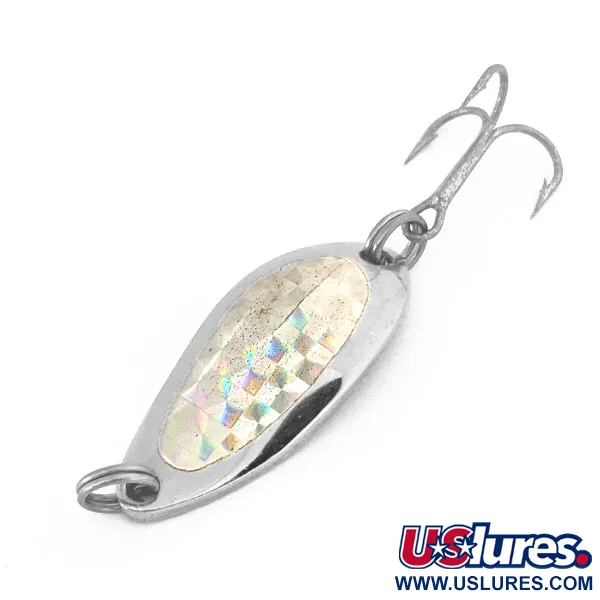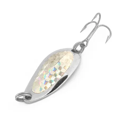 Una placcatura in nichel caratterizza l'esterno di questo Luhr Jensen 'Little Jewel' (codice 11132), un ondulante vintage fuori produzione da molti anni. Sul retro sono chiaramente stampati il marchio del produttore e il peso di 3/16oz (5g), mentre il lato anteriore convesso è contraddistinto da un inserto prismatico olografico testurizzato, progettato per un'elevata visibilità. Questo specifico esemplare misura 1 1/4" (3,3 cm) di lunghezza e risale al periodo di produzione statunitense del marchio a Hood River, Oregon. La componentistica include l'ancora originale montata in fabbrica e gli anellini spaccati, che rimangono lucidi e strutturalmente integri. Una valutazione delle condizioni di 5/5 riflette lo stato ben conservato della finitura in metallo lucido e dell'inserto in nastro prismatico.