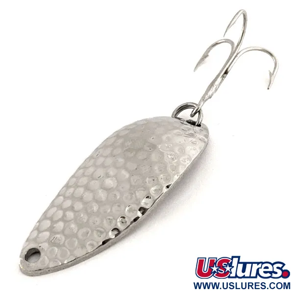 Con un peso di 12 g (2/5 oz), questo classico ondulante presenta una finitura in nichel martellato profondamente strutturata sulla faccia convessa, progettata per catturare e riflettere la luce da più angolazioni. Lungo 5,5 cm (2 1/4"), questo esemplare è il modello Little Jewel, un pezzo vintage di Luhr Jensen ormai fuori produzione da tempo. Il lato concavo dell'esca è chiaramente stampato con il nome del produttore, la designazione del modello "Little Jewel", l'origine U.S.A. e la marcatura del peso specifico. Costruito sia per lo spinning che per la traina, la forma a goccia dell'ondulante è abbinata a un'ancoretta affilata con finitura argentata. In condizioni 5/5, la nichelatura rimane brillante e altamente riflettente sia sulle superfici martellate che su quelle lisce. Un foro di attacco forato di precisione è posizionato all'estremità stretta per un anellino spaccato, mentre il codice prodotto 11769 identifica questo particolare ondulante da lancio spesso utilizzato dai pescatori che insidiano trote o salmoni in varie condizioni di limpidezza dell'acqua.