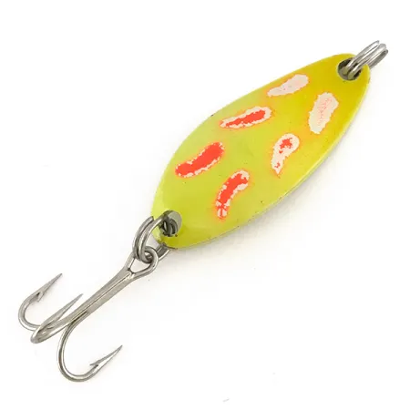 Con una lunghezza di esattamente 4 cm (1 1/2"), il corpo in metallo stampato di questo artificiale vintage presenta una classica base gialla con motivi fluorescenti rossi e bianchi a forma di goccia. Il Little Jewel, con codice prodotto 7519, è un modello storico della produzione statunitense di Luhr Jensen, ormai fuori catalogo da molti anni. Questo specifico esemplare da 7 g (1/4 oz) è caratterizzato da una speciale finitura UV Glow, che diventa altamente visibile in ambienti con scarsa illuminazione, come mostrato nelle immagini secondarie. La componentistica include un amo triplo in stile originale fissato da anellini spaccati in acciaio inossidabile, mantenendo l'integrità storica dell'esca. Le sue condizioni sono valutate 4/5, mostrando la vernice vivace e le marcature distinte che i collezionisti associano all'attrezzatura Luhr Jensen della metà del secolo. Le proprietà fluorescenti sono state specificamente progettate per la visibilità in acque profonde o torbide dove la luce naturale è limitata.