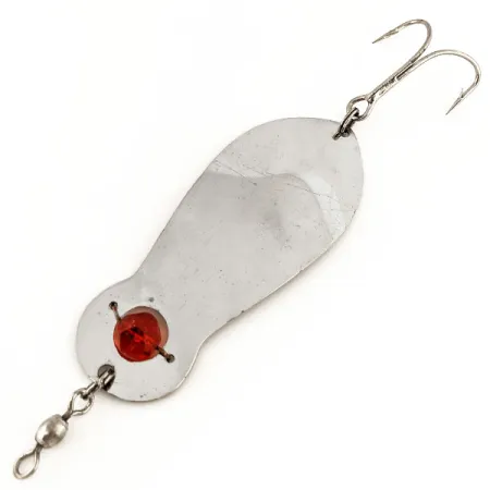 Una perlina di vetro rosso sfaccettata funge da punto focale vicino all'occhiello di questo ondulante Lucky Strike prodotto in Canada. Punzonato chiaramente sul retro con il marchio del produttore, questo esemplare rappresenta la classica finitura argentata diventata un elemento essenziale nelle cassette da pesca nordamericane. Con un peso di 25 g (1 oz) e una lunghezza di 8,5 cm (3 1/4"), offre una massa significativa per il lancio o la traina. Questo specifico esemplare, identificato dal codice 12653, è in condizioni 4/5, mantenendo una superficie brillante e riflettente. Un'interessante modifica si trova sull'armatura: una punta dell'ancoretta originale è stata intenzionalmente tagliata da un precedente proprietario per convertirla in un amo doppio, probabilmente per facilitare il passaggio tra erbai o strutture rocciose.
