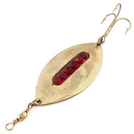 Lungo 9 cm (3 1/2"), questo cucchiaino Lucky Strike di fabbricazione canadese presenta un corpo placcato oro lucido che funge da base ad alta visibilità per l'elemento centrale dell'esca. Cinque perle rosse sfaccettate sono saldamente alloggiate in una fessura verticale centrale, una scelta di design intelligente pensata per creare un lampo di colore localizzato e catturare la luce da più angolazioni durante il movimento in acqua. Con un peso di 28 g (1 oz), la massa consistente e il profilo aerodinamico lo rendono una scelta affidabile per la traina in profondità o per lanci pesanti. Il corpo del cucchiaino è chiaramente stampato con il marchio del produttore e la scritta "LUCKY STRIKE", segno distintivo della storia manifatturiera del brand a Peterborough, Ontario. Identificato dal codice prodotto 13069, questo esemplare è dotato della sua componentistica originale, inclusi una robusta girella a barile e un'ancoretta pulita. La finitura dorata e gli inserti in perle rosse rimangono brillanti e ben integrati, con una valutazione di conservazione di 5/5.