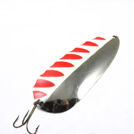 Lungo 11,5 cm, questo classico di produzione canadese è immediatamente riconoscibile per la sua decisa finitura Nichel / Rosso / Bianco. Il design "Half Wave" di questo modello 0734 presenta distinti accenti diagonali rossi e bianchi su un fondo di nichel ad alta lucentezza. Con un peso di 38 g, il corpo in metallo ad alto spessore è equipaggiato con un'ancoretta dalla finitura scura, costruita per resistere alle sollecitazioni della traina o dei lanci a lunga distanza. Il retro dell'ondulante reca la scritta stampata "LUCKY STRIKE CANADA", a testimonianza della sua eredità regionale. Questo esemplare vanta una valutazione di stato 4/5, mostrando una superficie brillante e ben conservata con minimi segni di utilizzo. Ogni elemento del Lucky Strike 4.5 Nickel Half Wave, dall'anellino spaccato all'applicazione della vernice, riflette la schietta funzionalità tipica delle attrezzature vintage prodotte nell'Ontario.