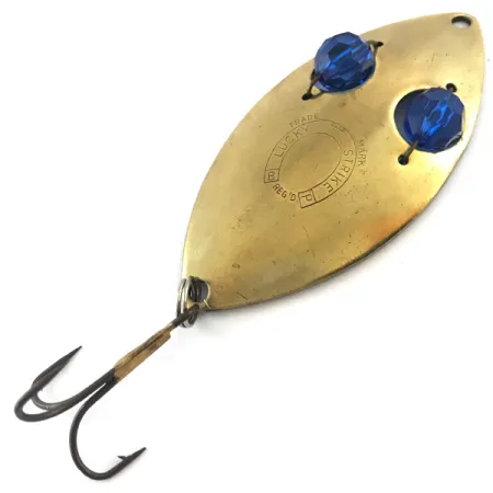 Il marchio «LUCKY STRIKE REG'D», impresso profondamente al centro del corpo dorato, identifica questo ondulante da 7,5 cm (3") come un pezzo classico della storia dell'attrezzatura canadese. Due perle blu sfaccettate sono fissate con un filo metallico attraverso la metà superiore dell'esca, fornendo un contrasto materico alla superficie liscia del metallo. Questo esemplare, con codice prodotto 5273, si presenta in condizioni eccellenti con una valutazione di 5/5. Con un peso di 21g (3/4 oz), l'ondulante è costruito per la distanza nel lancio o per mantenere la profondità durante la traina. L'attrezzatura include un'ancoretta con finitura scura fissata tramite un anello spaccato in coda. Il profilo a goccia è più largo nel punto medio, restringendosi significativamente verso l'occhiello di prua.