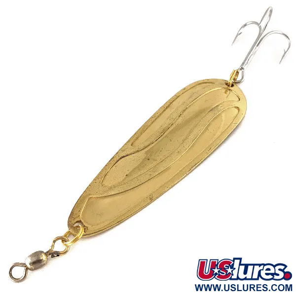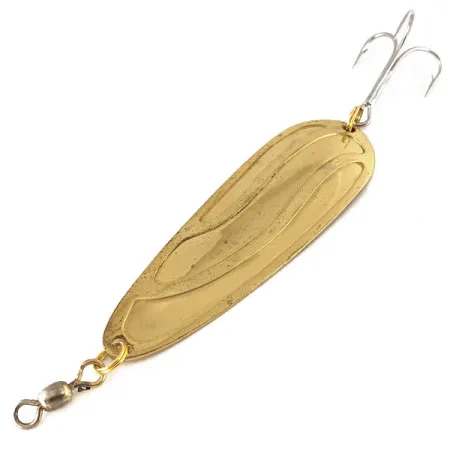 Con una lunghezza di 9 cm (3 1/2"), questo ondulante in metallo con finitura dorata rappresenta l'artigianato durevole sinonimo dell'attrezzatura Lucky Strike prodotta in Canada. Il corpo pesante da 28 g (1 oz) presenta una distintiva trama ondulata impressa nel metallo, che serve a catturare e riflettere la luce da diverse angolazioni quando immerso. Identificato dal codice prodotto 12479, l'artificiale è armato con una robusta ancora argentata e una girella a barile fissata tramite anelli spaccati a entrambe le estremità per un collegamento sicuro della lenza. La superficie concava interna è stampigliata con il marchio del produttore, preservando l'identità di questo esemplare vintage. Con una valutazione di 5/5, la placcatura in oro rimane eccezionalmente brillante su tutta la superficie, mostrando la finitura di alta qualità tipica della produzione del marchio.