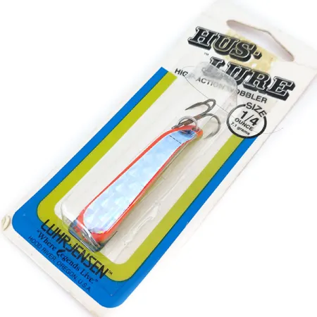 Brillante con una finitura a scaglie prismatiche, questo ondulante metallico da 7,1 g (1/4 oz) presenta una sorprendente combinazione di colori indicata sulla confezione vintage come Fire/Slvr P-Lite. Lungo esattamente 5 cm (2"), questo esemplare mai usato è conservato nel suo blister originale, testimonianza dell'epoca classica della produzione Luhr Jensen a Hood River, Oregon. Il codice prodotto specifico 1193-014-157 (rif. catalogo 10951) lo identifica come parte della serie High Action Wobbler, un design da tempo preferito dai pescatori per la sua versatilità nel lancio e nella traina a trote e pesci di minutaglia. Il nastro riflettente argentato sulla faccia dell'esca è bordato da un vivace bordo rosso-arancio, studiato per massimizzare la visibilità nella colonna d'acqua. Un affilato amo tripletta bronzato è assicurato da un robusto anello spaccato sul retro. Il cartoncino aggiunge un tocco di storia del marchio con lo slogan "Where Legends Live" e il marchio Litho in U.S.A. Come articolo inutilizzato (condizione 6), la finitura dell'esca è ben conservata e la confezione riflette il suo autentico stato vintage senza usura delle parti metalliche.
