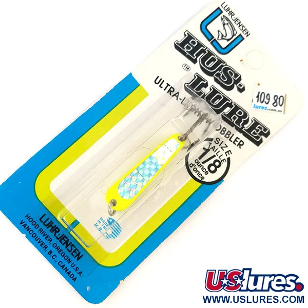 Con un peso di 1/8oz (4g), questo Hus-Lure ultra-leggero è una testimonianza della classica produzione americana dello stabilimento Luhr Jensen di Hood River, Oregon. L'ondulante da 1 1/2" (4cm) presenta una vivace combinazione di colori Silver e Chartreuse, notevolmente esaltata da un motivo prismatico a scacchi sull'inserto centrale. Classificato come «Wobbler» sulla confezione originale, la sua struttura è orientata al lancio leggero o alla traina. Una caratteristica tecnica fondamentale di questo modello 10980 è la finitura fluorescente attiva ai raggi UV; sotto la luce ultravioletta, i bordi chartreuse brillano con alta intensità per fornire visibilità in condizioni di scarsa illuminazione o in acque torbide. Questo esemplare è inutilizzato, conservato nella sua confezione originale vintage. La dotazione include un amo triplo montato in fabbrica e un robusto anellino spaccato, mentre il corpo metallico stesso è stampato con il marchio «Made in USA» sul retro.