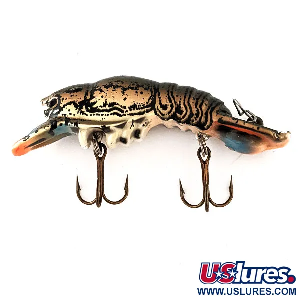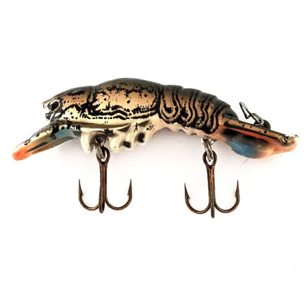 Un dettagliato motivo a gambero con tonalità bruno-dorate e screziature nere ricopre il corpo di questa esca, offrendo una realistica imitazione del foraggio naturale. Con un peso di 1/4 oz (7 g), questo modello galleggiante è costruito per il lancio e il twitching, raggiungendo profondità di circa 1,5 m. I collezionisti cercano spesso il codice prodotto 11643, che rappresenta la qualità della produzione Luhr Jensen negli USA. Questo esemplare da 2 3/4" (7 cm) è in condizioni 5/5, con vivaci accenti arancioni sulla coda e sulla paletta anteriore. Si tratta di un'esca rumorosa a risalita lenta, progettata per scatenare gli attacchi di lucci e persici. L'hardware è composto da due ancorette originali color bronzo. Posizionando l'attacco del filo sulla pinna caudale, i progettisti hanno fatto sì che l'esca si muova all'indietro nella colonna d'acqua, proprio come un gambero in preda al panico.