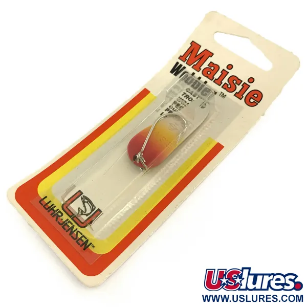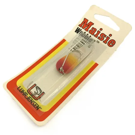 Con un peso di 7g (1/4oz), questo ondulante Luhr Jensen Maisie è un pezzo di storia della pesca del Nord-Ovest ottimamente conservato. La colorazione Shoshone/Brass è caratterizzata da una vivace sfumatura rossa che degrada in un giallo dorato sul corpo in ottone. Lungo 4 cm (1 1/2"), l'artificiale non è mai stato usato e si trova ancora nella sua confezione originale di fabbrica. Il retro del cartoncino riporta un'etichetta SKU dettagliata, 1081-014-0603, che indica come data di produzione l'11 dicembre 2003. Questo modello, identificato dal codice prodotto 18029, è armato con un amo singolo e un anellino spaccato ultra resistente. La confezione mostra l'iconico logo della trota saltante di Luhr Jensen e ne conferma la produzione negli USA. Un avviso relativo alla presenza di piombo sul retro fornisce informazioni sui materiali utilizzati nella costruzione dell'ondulante in quel periodo.