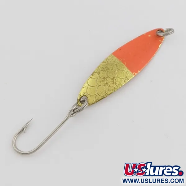 Motivi a scaglie in ottone incisi sul lato con finitura dorata di questa lama da 3,5 cm (1 1/2") offrono una texture classica progettata per catturare la luce nella colonna d'acqua. Con un peso di 2 g (1/16 oz), il corpo metallico presenta un'applicazione di vernice rossa vibrante sulla metà inferiore che crea un bersaglio ad alto contrasto per la trota di lago. Il retro mostra chiaramente il marchio stampato Luhr Jensen Hood River, Ore. e il nome del modello Needlefish, riflettendo gli standard di produzione della sua origine USA. Questo ondulante dal profilo sottile è progettato per la traina a velocità di circa 2,5 km/h (1,5 mph) e rende bene nelle fresche acque primaverili se fatto correre a circa 30 m (100 ft) dietro la barca su lenza da 8–10 lb. Classificato con una condizione di 5/5, la finitura di fabbrica e la stampigliatura rimangono nitide e ben conservate su questo articolo specifico, codice prodotto 24513.