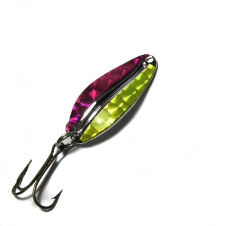 Segmenti in Nichel, Ologramma Rosso Scuro e Ologramma Giallo Fluorescente creano un motivo visivo d'impatto sull'ondulante Main liner. Con una lunghezza di 4 cm (1 1/2") e un peso di 7,5 g (1/4 oz), questo componente TODDCO prodotto negli USA è costruito su una base di nichel lucidato progettata per massimizzare i riflessi. Il codice prodotto 0414 rappresenta un profilo classico destinato allo spinning o alla traina, dotato di un robusto anellino spaccato e un'ancoretta bronzata. La finitura è eccezionalmente ben conservata, meritando una valutazione di condizione 5/5 senza imperfezioni visibili sulla lamina olografica o sui bordi metallici. Punzonata sul retro, la struttura metallica mostra la precisione tipica dell'attrezzatura statunitense di quest'epoca, garantendo l'integrità strutturale dell'esca.