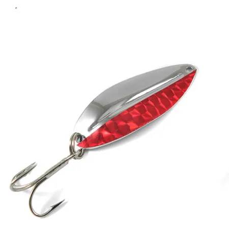 Scintillante con una finitura in nichel lucidato, questo ondulante da 14 g (1/2 oz) rappresenta l'artigianato classico americano di TODDCO. Con una lunghezza di 5,5 cm (2 1/4"), il Main Liner, identificato dal codice prodotto 0785, presenta un design bicolore distintivo sulla faccia anteriore. Una metà longitudinale della paletta mantiene una brillante lucentezza argentata, mentre l'altro lato è coperto da un nastro prismatico rosso vibrante. Il retro rimane completamente in nichel lucidato, evidenziando la spina dorsale centrale che conferisce all'esca il suo profilo rigido. Questo esemplare è equipaggiato con un'ancoretta e un anello spaccato, adatti per il casting pesante o la traina. Ogni superficie rimane altamente riflettente su questo pezzo in condizioni 5/5, compreso l'adesivo originale sul nastro rosso.