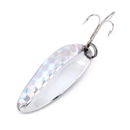 Le finiture in nichel e ologramma definiscono il profilo visivo di questo TODDCO Main liner, un classico ondulante di fabbricazione americana prodotto fino al 1980 circa. Con una lunghezza di 5 cm (2") e un peso di 11 g (2/5 oz), l'esca presenta un caratteristico approccio a doppia superficie: una faccia è lucidata a specchio con finitura nichel, mentre l'altra è decorata con un motivo olografico sfaccettato progettato per riflettere la luce in più direzioni. La struttura è in solido metallo stampato, tipica della qualità degli stabilimenti statunitensi di TODDCO in quell'epoca. Questo specifico esemplare, identificato dal codice prodotto 10117, rimane in condizioni eccellenti, meritando una valutazione di 5/5 per le superfici pulite e la componentistica intatta. L'armamento include un'ancoretta affilata fissata da un robusto anellino spaccato, pronto per il lancio o il vertical jigging. Un singolo occhiello in testa funge da punto di attacco per un moschettone o un finale, completando la forma aerodinamica a goccia.