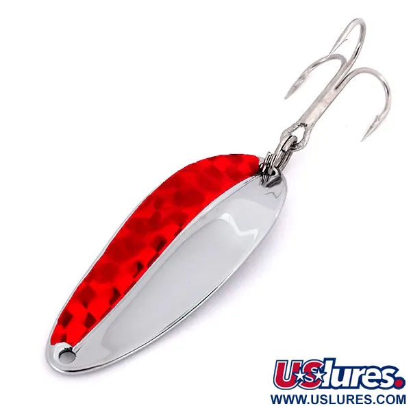 Il nichel e i motivi a scaglie rosse definiscono l'estetica sorprendente di questo ondulante americano vintage. Prodotto da TODDCO fino al 1980, il Main liner misura 5 cm (2") e presenta una finitura lucida su metà della faccia e su tutto il retro. La sezione rossa è testurizzata con un inserto riflettente a scaglie che contrasta nettamente con il nichel argentato. All'estremità posteriore è fissata un'ancoretta affilata tramite un robusto anello brisé, mentre la testa è forata per l'attacco diretto della lenza. Con un peso di 11 g (2/5 oz), l'esca è identificata dal codice prodotto 10155 e mantiene una valutazione di conservazione di 5/5. Questo modello prodotto negli USA mette in mostra le linee pulite e la componentistica tipiche dell'attrezzatura metallica di metà secolo.