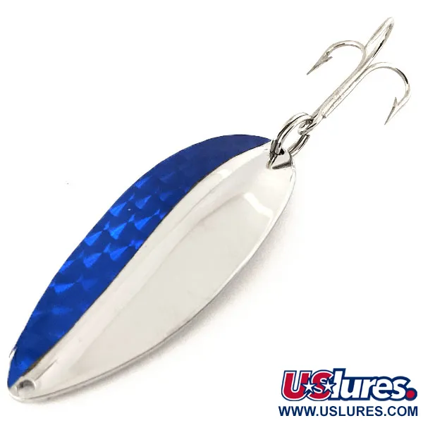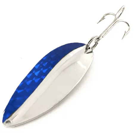 Lungo esattamente 6,5 cm (2 1/2"), questo TODDCO Main liner presenta un design che è stato un punto fermo nelle cassette da pesca americane fino al 1980. La sua colorazione bicolore Nichel / Blu è particolarmente degna di nota, con metà del lato convesso caratterizzata da un nastro prismatico blu che riflette la luce attraverso un netto motivo geometrico. Il metallo sottostante è un nichel lucido e brillante che si estende fino al lato concavo interamente argentato. Questo esemplare, identificato dal codice prodotto 11844, pesa 21 g (3/4 oz), il che lo rende una scelta solida per raggiungere distanze di lancio elevate. L'attrezzatura consiste in un singolo grande amo triplo fissato tramite un robusto anello spaccato, mentre l'attacco della lenza sulla testa è un semplice foro trapanato con precisione. Come reperto storico della pesca statunitense ben conservato, le condizioni di questo ondulante sono 5/5, mantenendo una finitura lucida sia sul metallo che sull'inserto decorativo blu.