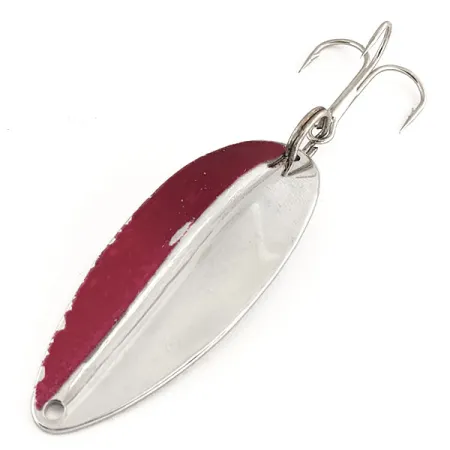 Un'audace striscia diagonale di vernice rosso scuro copre metà della faccia convessa, creando un netto contrasto con la finitura in nichel lucido di questo ondulante vintage. Questo TODDCO Main liner, catalogato con il codice 12221, misura 5,5 cm (2 1/4") e pesa 12,5 g (2/5 oz). Prodotto negli USA prima del 1980, l'esca presenta una caratteristica nervatura longitudinale al centro del corpo metallico, che conferisce un profilo unico rispetto ai modelli più piatti. Il lato posteriore rimane in nichel pulito e non verniciato, mostrando la qualità della placcatura originale. Un'ancoretta argentata è fissata saldamente tramite un anellino spaccato in coda. Questo esemplare è in ottime condizioni, mantenendo colori vivaci e superfici metalliche brillanti (valutazione 5/5). Un singolo foro di attacco è forato all'estremità stretta per il montaggio diretto.