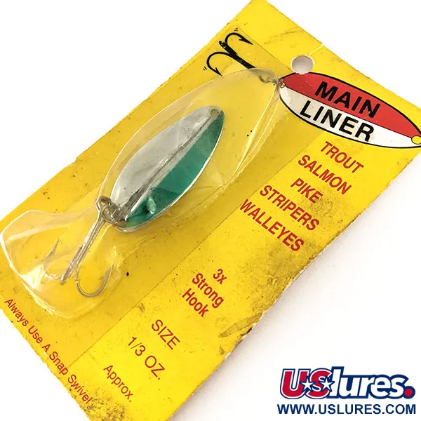 Con un peso di 11 g (2/5 oz) e una lunghezza di 5 cm (2"), l'ondulante Main liner rappresenta un pezzo di storia della pesca del Michigan di TODDCO Products. La colorazione Nickel / Verde offre un contrasto distintivo sulla superficie della paletta, abbinata a un amo 3x strong costruito per resistere agli attacchi violenti di salmoni o lucci. Identificato dal codice 12335, l'artificiale è inutilizzato e conservato nella sua confezione vintage originale, con un punteggio di condizione pari a 6. Progettato per lavorare in profondità, si presta perfettamente sia al lancio che alla traina. Il retro della confezione ne attesta l'origine a Grand Rapids, confermando l'autenticità di un'esca prodotta negli Stati Uniti prima degli anni '80.