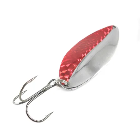 Un vistoso motivo prismatico rosso copre metà di questo ondulante da 21g, creando un netto contrasto con la finitura in nichel lucido. Prodotto negli USA da TODDCO, il modello Main Liner 1573 è un pezzo distintivo di attrezzatura vintage di un produttore non più attivo. Questo esemplare misura 6 cm e presenta un corpo in metallo a forma di goccia con una parte inferiore pulita e riflettente. La componentistica include un'ancoretta appena installata fissata tramite un robusto anellino spaccato, assicurando che l'esca sia pronta per la collezione o l'uso. Con una valutazione di 4/5, il metallo mantiene una superficie brillante e il dettaglio prismatico è ben conservato. Un piccolo adesivo identificativo è applicato sulla superficie liscia in nichel sul retro.