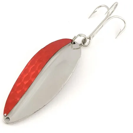 Una texture martellata copre esattamente metà della lamina di questo ondulante da 21 g (3/4 oz), creando un profilo visivo ad alto contrasto. Conosciuto come Main Liner di TODDCO, codice prodotto 21487, questo artificiale da 6,5 cm (2 1/2") rappresenta la produzione americana di articoli da pesca dell'era precedente al 1980. Lo schema cromatico è un netto contrasto tra nichel lucido e un rosso profondo, con il lato rosso che presenta una superficie martellata che aggiunge profondità fisica al metallo. Viene fornito armato con un'ancoretta affilata e un robusto anellino spaccato, mentre un singolo foro punzonato in punta funge da punto di attacco per la lenza. Questo specifico esemplare mantiene una finitura eccezionalmente pulita, ottenendo una valutazione di conservazione di 5/5. La costruzione in metallo stampato è bilanciata per un uso versatile in applicazioni a spinning o a traina.