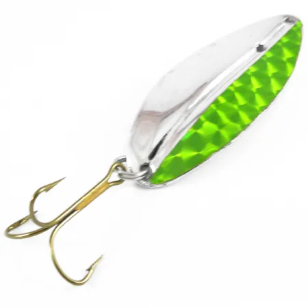 Con un peso di 2/5 oz (11 g), il TODDCO Main liner è un classico cucchiaino ondulante americano prodotto prima del 1980. Lungo 2 1/4" (5,5 cm), questo esemplare presenta una distintiva finitura Nichel / Verde con un motivo a nido d'ape verde brillante applicato su metà della faccia riflettente. L'armatura include una robusta ancoretta dorata fissata con un anello spaccato, priva di segni di usura. Identificato dal codice prodotto 3670, l'artificiale è in condizioni 5/5, con il nichel lucidato sul retro che rimane brillante e senza graffi. Questo artificiale made in USA mette in mostra la struttura robusta e l'estetica semplice ed efficace che ha definito il marchio TODDCO prima della cessazione della produzione. Le linee pulite e il contrasto tra l'inserto verde neon e la superficie in nichel cromato lo rendono un pezzo eccezionale per qualsiasi collezione di attrezzatura vintage.