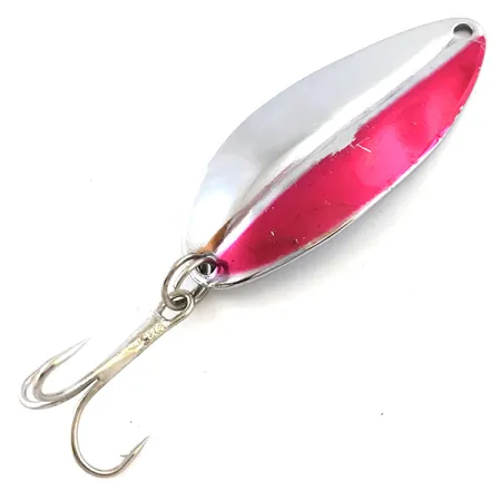 Un peso distintivo di 2/5 oz (12,5 g) conferisce al Main liner di TODDCO la sua sostanza per il lancio e la traina. Questo specifico esemplare, catalogato con il codice 5244, mostra un classico design americano di un produttore che ha realizzato queste esche negli USA fino al 1980. Con una lunghezza di 2 1/4" (5,5 cm), l'ondulante presenta una colorazione Nichel / Rosso d'impatto, dove un lato è diviso tra un nichel lucido e una vivace striscia traslucida rosso-rosa. Il lato posteriore mantiene una finitura in nichel pulita e uniforme con una prominente cresta centrale che conferisce integrità strutturale al corpo metallico. La componentistica consiste in un'ancoretta affilata fissata tramite un anellino brisé in coda. L'esca è in condizioni 5/5, mantenendo la sua lucentezza metallica originale e la qualità della vernice.