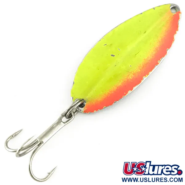 Finiture giallo e arancio fluorescente definiscono il carattere visivo del TODDCO Main liner, un ondulante di produzione americana realizzato fino al 1980. Con un peso di 12,5 g (2/5 oz) e una lunghezza di 5,5 cm (2 1/4"), il corpo metallico è rivestito con una vernice ad alta visibilità che reagisce intensamente ai raggi UV, emettendo una luminescenza verde in acque profonde o scure. Il retro in nichel lucido aggiunge un contrasto metallico tradizionale. Contrassegnato dal codice 6887, questo esemplare è in condizioni 5/5. Un’ancoretta singola è collegata tramite anello spaccato per lo spinning o la traina. La struttura in metallo stampato e la transizione cromatica riflettono le tecniche di produzione statunitensi dell'epoca.