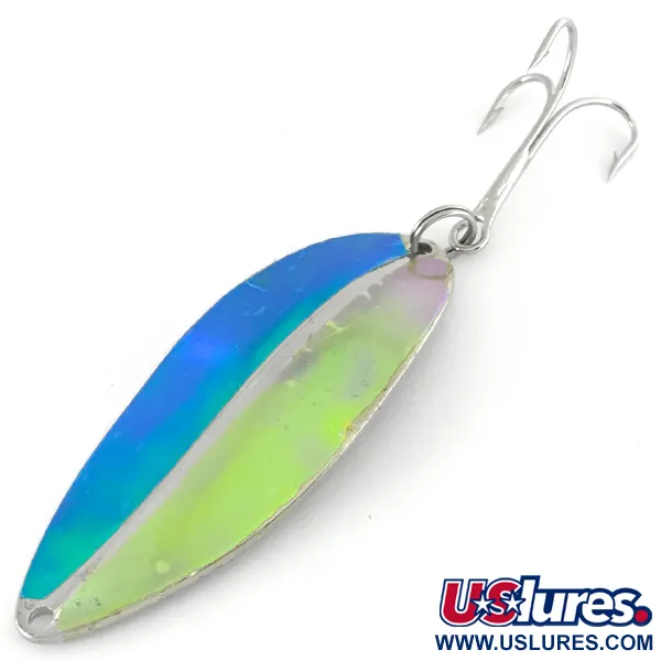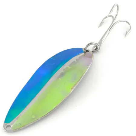 Con un peso di 3/4 oz (21 g), questo ondulante di fabbricazione americana presenta una caratteristica chiglia dorsale che percorre l'intera lunghezza del corpo da 2 1/4" (6 cm). Prodotto da TODDCO negli Stati Uniti fino al termine della produzione nel 1980, il Main liner rimane un pezzo fondamentale per i collezionisti di esche metalliche della metà del secolo scorso. La finitura Green / Nickel su questo esemplare, identificato dal codice prodotto 7020, mostra una brillante lucentezza cangiante sul lato frontale che sfuma dal blu profondo al verde lime acceso. Sul retro, l'esca rivela una finitura in nickel lucido progettata per garantire il massimo bagliore. Valutato con una condizione di 5/5, mantiene la sua lucentezza originale di fabbrica ed è equipaggiato con una robusta ancoretta argentata fissata tramite un solido anello spaccato.