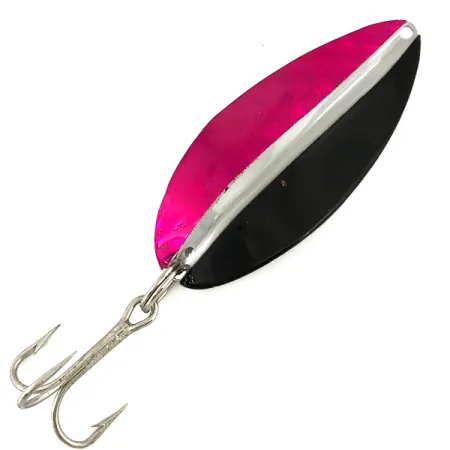 Un peso di 21 g (3/4 oz) conferisce al Toddco Main Liner una densità sostanziale per la traina in acque profonde o per lanci a lunga distanza. Questo ondulante a foglia di salice da 6,5 cm (2 1/2") presenta una netta divisione cromatica longitudinale sulla faccia anteriore, con un lato rosso scuro metallizzato contrapposto a una metà nera tinta unita. Una venatura in nichel lucido corre lungo il centro, rispecchiando la finitura interamente in nichel sul retro del metallo. Identificata dal codice prodotto 7337, questa esca di fabbricazione americana rappresenta un'epoca classica della produzione Toddco terminata nel 1980. L'hardware terminale è un amo triplo affilato fissato da un anello spaccato e la condizione generale è valutata 5/5. L'occhiello stampato nella parte superiore è forato in modo pulito per nodi diretti o moschettoni.