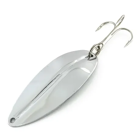 La nichelatura conferisce una finitura a specchio a questo ondulante Main liner a forma di foglia, un design prodotto da TODDCO negli USA fino al 1980. Il corpo da 2 1/4" (5,5 cm) è stampato con una distinta nervatura centrale che aggiunge rigidità strutturale al metallo. Nella parte anteriore, un foro punzonato consente l'attacco diretto della lenza, mentre il retro dell'esca da 12,5 g (2/5 oz) monta un robusto amo triplo fissato da un anellino spaccato rinforzato. Valutata in condizioni 5/5, la superficie rimane brillante e priva di usura visibile. Questo esemplare, identificato dal codice prodotto 8606, è un solido esempio di ondulante americano di metà secolo destinato allo spinning o alla traina.