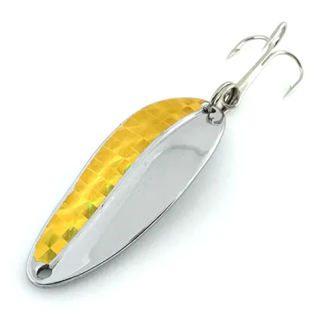 Una pellicola olografica dorata copre esattamente metà del corpo nichelato di questo ondulante TODDCO Main Liner da 2 pollici (5 cm). Con un peso di 11 g (2/5 oz), l'esca è costruita su una solida base metallica con una marcata chiglia longitudinale sul lato posteriore per influenzarne l'assetto. Questo esemplare, identificato dal codice prodotto 8651, non è mai stato usato e conserva la lucentezza originale di fabbrica sia sul nichel lucidato che sulla lamina d'oro testurizzata. Prodotto negli USA fino al 1980, il design TODDCO prevedeva un'unica ancoretta fissata tramite un robusto anello spaccato in coda. Il contrasto tra la finitura argento liscia e i motivi geometrici del lato olografico dorato crea un profilo visivo a due tonalità tipico dell'attrezzatura americana del tardo XX secolo. Un singolo foro netto in punta funge da punto di attacco principale per il lancio o la traina.