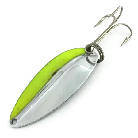 Le finiture nickel e chartreuse creano un contrasto visivo elevato su questo ondulante Main liner, un design prodotto da TODDCO negli USA fino al 1980. Con un peso di 12,5g (2/5oz) e una lunghezza di 5,5cm (2 1/4"), il profilo sottile del corpo è ideale per il lancio e la traina. La superficie metallica riflettente è bilanciata da una vivace striscia neon lungo un lato, garantendo visibilità in diverse condizioni d'acqua. Catalogato con il codice prodotto 9375, l'artificiale è dotato di un classico anellino spaccato e di una robusta ancoretta. Questo specifico esemplare è in condizioni 5/5, con una superficie brillante e pulita che mette in risalto la qualità della produzione vintage americana.