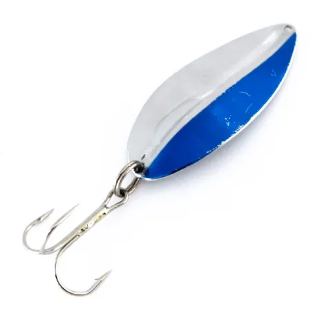 Divisa al centro, la parte anteriore di questo ondulante presenta un contrasto ad alta visibilità tra la nichelatura riflettente e lo smalto blu intenso. Prodotto negli USA fino al 1980, il TODDCO Main liner, codice prodotto 9981, sfoggia un classico profilo a forma di foglia adatto a varie applicazioni di lancio e traina. Con i suoi 21 g (3/4 oz), il corpo in metallo garantisce una densità notevole per il telaio da 6,5 cm (2 1/2"), abbinato a una grande ancora assicurata da un robusto anello spaccato. Mentre il lato anteriore è bicolore, il retro è rifinito in nichel lucido uniforme su tutta la lunghezza. Questo specifico esemplare rimane in ottime condizioni, meritando un punteggio di 5/5. Un singolo foro per il legame della lenza si trova sulla punta affusolata della piastra da 6,5 cm (2 1/2").