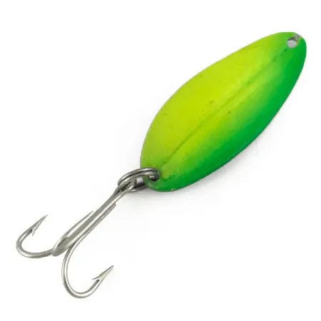 Un peso di 11 g conferisce a questo ondulante da 5 cm la densità necessaria per lanci efficienti negli strati d'acqua più profondi. Identificato con il codice 7305, questo TODDCO Main liner UV presenta una vivace sfumatura da giallo a verde che ne sottolinea l'eredità americana precedente al 1980. Il dettaglio più sorprendente è la vernice UV-attiva; come visibile nella seconda immagine, reagisce con una forte luminescenza per aumentare la visibilità in condizioni di scarsa illuminazione. La struttura include un singolo foro di attacco e un robusto anello spaccato collegato a un amo triplo color argento. Valutata 5/5, l'esca è in condizioni eccellenti, con la vernice e i componenti metallici che non mostrano segni di usura o del tempo. Una sottile venatura longitudinale corre lungo il centro del lato convesso, restringendosi dolcemente verso l'occhiello dell'amo.