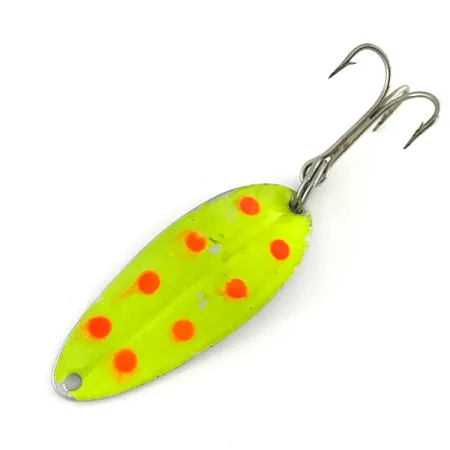 Vernice gialla e vivaci punti rossi distinguono il lato frontale di questo TODDCO Main liner UV, un classico ondulante prodotto negli USA prima del 1980. Con un peso di 11 g, l'esca presenta un retro con finitura al nickel e una robusta ancoretta fissata tramite un anello spaccato. Questo specifico Main liner, identificato dal codice prodotto 7555, dimostra l'adozione precoce di finiture fluorescenti nel design dell'attrezzatura vintage. Se esposta alla luce ultravioletta, la base gialla si trasforma in un verde neon brillante mentre i punti rossi mantengono un bagliore intenso ad alto contrasto per la visibilità nelle colonne d'acqua più profonde. Con una lunghezza di 5 cm, l'esemplare è in condizioni 5/5, con la finitura originale ancora vibrante e i componenti metallici lucidi. La forma affusolata dell'ondulante e la pesante base in nickel suggeriscono un design adatto per il lancio o per il jigging verticale.