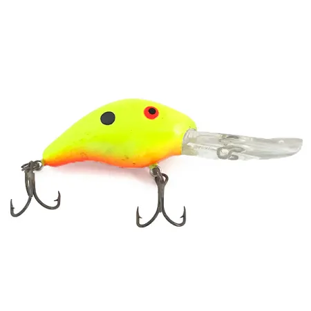 Una vivace finitura Yellow and Orange ricopre questo corpo compatto da 5 cm (2"), rendendolo una scelta ad alta visibilità per acque velate. Questo crankbait Mann's Bait Company 10+, identificato dal codice prodotto 6754, è un classico deep diver prodotto negli USA dal peso di 10 g (1/3 oz). Progettato per raggiungere profondità fino a 3 m (10 ft), la sua grande paletta trasparente è una caratteristica distintiva sia per il lancio che per la traina. Mann's è da tempo stimata per questi specifici artificiali della serie "Plus", progettati per un recupero costante o per presentazioni stop-and-go. Osservando da vicino l'esemplare, la vernice rimane nitida e vibrante, con una valutazione delle condizioni di 5/5. L'esca presenta i caratteristici grandi occhi "target" neri e rossi sui lati, abbinati ad ancorette originali con finitura scura. Il passaggio dal dorso chartreuse brillante al ventre arancione offre un netto contrasto rispetto alla paletta trasparente.