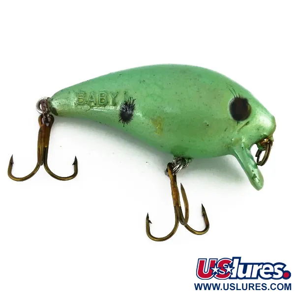 Un peso di 1/4 oz (7 g) conferisce a questo shallow-runner la massa necessaria per lanci accurati in mezzo a ostacoli fitti. Lungo 2 1/4" (6 cm), l'esca presenta una finitura perlacea Green / Black e il riconoscibile marchio in rilievo "BABY" sul fianco. Mann's Bait ha progettato questo modello per restare nello strato superficiale della colonna d'acqua, raggiungendo una profondità massima di soli 0,3 m (1 ft). Il design include un particolare pattern oculare con sottili linee radiali e un singolo punto nero laterale tipico delle produzioni vintage degli USA. Tutta la minuteria originale è presente, inclusi due robusti ami tripli e un anello spaccato, garantendo a questo articolo una valutazione di 5/5. Il codice prodotto 9711 è stampato con una paletta corta e inclinata che limita la discesa mantenendo un assetto galleggiante.