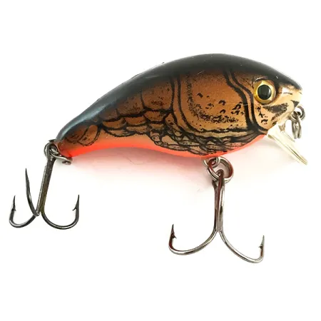Un vivace ventre arancione offre un contrasto sorprendente rispetto al motivo scuro SB333 Brown crawFish su questo shallow runner da 11g (2/5 oz). Questo Mann's Mid 1- Minus da 6 cm (2 1/4 inch) è costruito per rimanere vicino alla superficie, con una profondità di nuoto limitata a 0–30 cm (0–1 ft), rendendolo uno strumento specializzato per lavorare appena sopra gli erbai a caccia di lucci e sandre. La finitura del corpo è eccezionalmente ben conservata, mettendo in mostra le intricate linee nere che imitano il carapace di un gambero sulla metà superiore marrone-oro. Prodotto negli USA e identificato dal codice prodotto 6479, l'esca presenta una paletta trasparente in plastica e componentistica originale che rimane lucida e funzionale. Ha una valutazione di condizione 5/5. Gli occhi dorati sono ben allineati, completando l'estetica di questo crankbait galleggiante progettato per il lancio, il twitching o la traina.