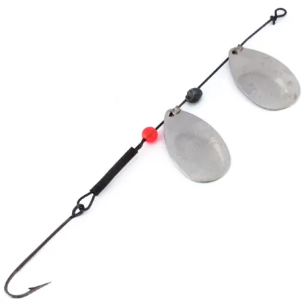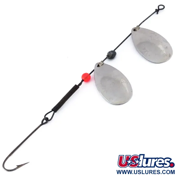 La nichelatura riveste le palette tandem di questo spinner rig da 12,0 cm (4 3/4"), garantendo un lampo luminoso in varie condizioni d'acqua. Con un peso di 3,4 g (1/8 oz), l'esca è costruita su un asse metallico scuro e presenta una singola perlina rossa che funge da punto d'attacco tra la paletta inferiore e l'amo. La configurazione tandem utilizza due palette a goccia per massimizzare la superficie mantenendo un profilo sottile per il lancio o la traina. Un amo singolo con punta affilata è fissato nella parte posteriore, rinforzato con un manicotto nero per la stabilità. Con il codice prodotto 10143, questa esca a marchio Marathon è stata prodotta negli USA con un'attenzione particolare alla durata. Lo stato è valutato 4/5, mostrando una finitura metallica ben conservata e minuteria pulita. Un semplice occhiello in metallo sulla parte anteriore permette un nodo diretto o l'uso di un piccolo snap.