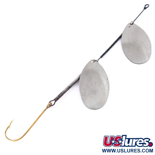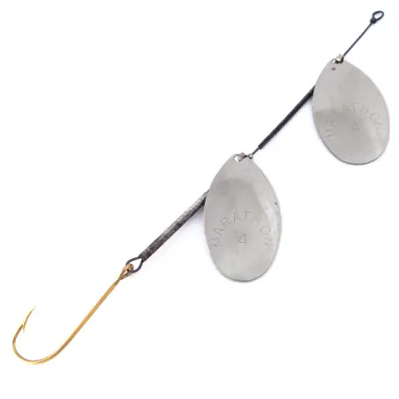 Due pale a forma di goccia stampate con il numero 4 caratterizzano questo classico cucchiaino rotante nichelato della Marathon Bait Company. Con una lunghezza totale di 15 cm (6"), questo esemplare, identificato dal codice prodotto 10476, presenta una finitura al nichel brillante che rimane straordinariamente pulita. Con un peso di 7 g (1/4 oz), l'esca è costruita su un telaio in metallo scuro che termina con un singolo amo dorato. Una piccola perla rossa traslucida è posizionata tra i cavalierini, fornendo un sottile punto di contrasto visivo rispetto ai componenti metallici. Questa attrezzatura prodotta nel Wisconsin rappresenta l'era di metà secolo di un produttore che ha operato dal 1929 al 1979. La ferramenta è in eccellenti condizioni, classificata 5/5, mostrando la natura ben conservata del filo e la definizione nitida degli stampi sulle pale. Ogni componente, dagli avvolgimenti del filo al gruppo a doppia pala, è tipico dei design durevoli prodotti durante i 50 anni di storia dell'azienda nel Midwest americano.