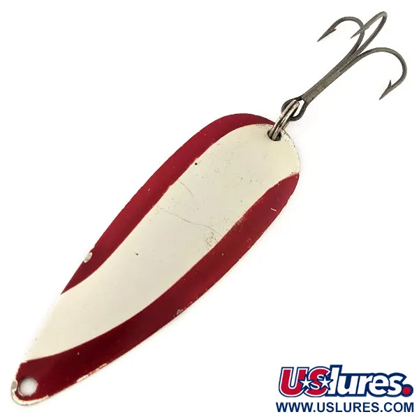 La nichelatura sul lato concavo presenta il marchio „MARATHON“, firma dell'azienda del Wisconsin che ha prodotto esche dal 1929 al 1979. Con una lunghezza di 7 cm (2 3/4"), questo cucchiaino sfoggia il classico motivo a strisce diagonali rosse e bianche su una base di nichel lucido. Con un peso di 14 g (1/2 oz), l'esca è costruita per il lancio in strutture profonde o lungo i bordi degli erbai. Questo esemplare, identificato dal codice prodotto 11280, è in condizioni 5/5, mantenendo la lucentezza originale della vernice e superfici metalliche pulite. La componentistica consiste in un robusto anellino spaccato e un'ancora singola, che riflettono gli standard di produzione durevoli dell'attrezzatura americana di metà secolo. Il lato convesso è rifinito con smalto liscio, mentre il retro offre una superficie riflettente ad alto contrasto per la visibilità in varie condizioni d'acqua.