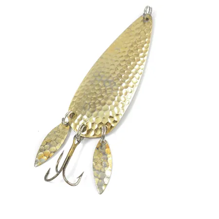 Una trama in oro martellato definisce il corpo a forma di goccia di questo ondulante americano vintage. Dotato di due piccole "Sonic Blades" attaccate alla coda insieme all'amo triplo, questo Marathon 2 (codice prodotto 2080) offre un profilo complesso per il lancio o la traina. L'azienda Marathon, con sede negli USA, ha costruito questi artificiali su una base in ottone massiccio, visibile sul retro liscio. Con un peso di 14g (1/2oz) e una lunghezza di 7cm (2 3/4"), l'esca mantiene una finitura brillante e riflettente sulla sua superficie martellata. La minuteria rimane robusta, compresi gli anelli spaccati che sorreggono le lamelle ausiliarie. Questo esemplare è in condizioni 4/5, mostrando un'usura superficiale molto leggera e minimi segni di conservazione.