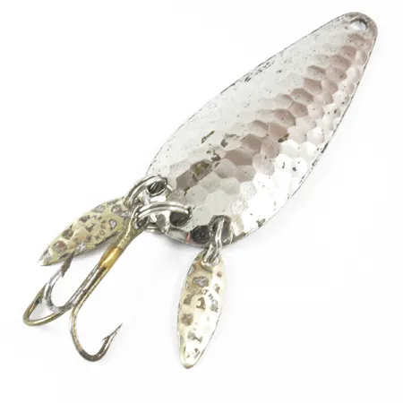 Le texture in nichel martellato catturano la luce sull'ampia superficie di un classico ondulante della Marathon Bait Company. Identificato dal codice 3480, questo artificiale prodotto nel Wisconsin misura 6 cm (2 1/4") di lunghezza e pesa 12 g (2/5 oz). Una caratteristica distintiva di questo modello è l'inclusione di due piccole lamelle 'sonic' attaccate agli anelli spaccati inferiori. Queste mini-lamelle forniscono ulteriore flash e imitano il movimento di una pinna caudale, aiutando al contempo a nascondere l'affilata ancoretta. Sul lato posteriore liscio è stampato chiaramente il nome 'MARATHON', marchio di fabbrica dell'azienda che ha operato negli USA dal 1929 al 1979. La finitura martellata sul lato convesso offre una superficie riflettente sfaccettata per il lancio. Questo esemplare mantiene una valutazione di condizione 4/5, con minuteria ben conservata e una finitura pulita.