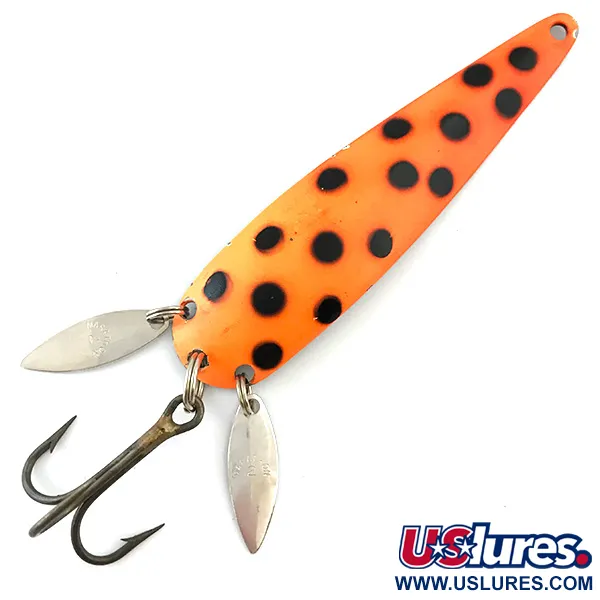 Con un peso di 17 g (3/5 oz), questo cucchiaino ondulante vintage presenta una vivace colorazione Rosso/Nero/Nichel che cattura immediatamente l'attenzione. Conosciuto come Marathon UV, codice 5600, è dotato di una coppia di palette vibranti allungate in nichel montate sugli anelli posteriori, progettate per generare lampi di luce e mascherare l'affilata ancoretta. Queste palette specializzate creano un profilo visivo unico mentre fluttuano lungo il corpo lungo 9,5 cm (3 3/4"). La Marathon Bait Company, un punto di riferimento nella produzione di attrezzatura da pesca nel Wisconsin dal 1929 al 1979, ha impresso chiaramente il proprio marchio sul retro in nichel lucidato di questo esemplare. Classificato con una condizione di 5/5, l'esca presenta una superficie eccezionalmente pulita con vernice brillante e minuteria lucida priva di corrosione.