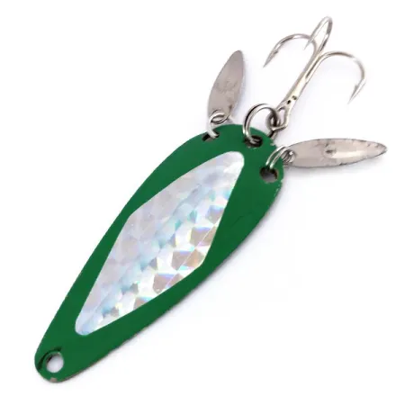 Vernice verde e un adesivo olografico prismatico con motivo a diamante distinguono il lato superiore di questo ondulante vintage prodotto nel Wisconsin. Con un peso di 12 g (2/5 oz) e una lunghezza di 6 cm (2 1/4"), questo artificiale presenta l'aggiunta innovativa di due piccole alette sonore allungate fissate agli anellini spaccati posteriori. Queste alette color argento forniscono un riflesso extra vicino all'ancoretta, imitando la pinna caudale di un pesce esca e aiutando a nascondere la minuteria. Sul retro, la superficie in nichel lucido reca il classico stampo MARATHON, marchio di fabbrica della Marathon Bait Company, che ha prodotto attrezzatura dal 1929 al 1979. La nichelatura rimane brillante e riflettente, mostrando la qualità artigianale tipica dell'attrezzatura americana di metà secolo. Identificato dal codice prodotto 10006, questo esemplare è in ottime condizioni, con un punteggio di 5/5 per le superfici pulite. La minuteria, inclusi gli anellini e l'ancoretta affilata, è di alta qualità.