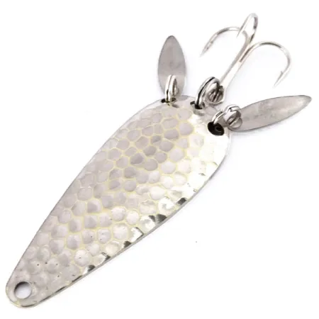 La placcatura in nichel martellato cattura la luce sulla superficie irregolare di questo ondulante da 6 cm (2 1/4"). Vicino all'affilata ancoretta sono montate due piccole palette soniche allungate che ruotano su anellini spaccati. Queste piccole appendici extra hanno uno scopo visivo specifico: mascherano la componentistica metallica creando l'illusione di una pinna caudale in movimento. Questo esemplare presenta il marchio inciso "MARATHON" sul retro lucido, un omaggio al produttore del Wisconsin che ha operato per cinquant'anni a partire dal 1929. Con un peso di 12 g (2/5 oz), l'esca garantisce un'ottima densità per la precisione nel lancio. Identificato dal codice prodotto 10044, l'ondulante mantiene la sua lucentezza originale e la sua integrità strutturale, con una valutazione dello stato pari a 5/5.
