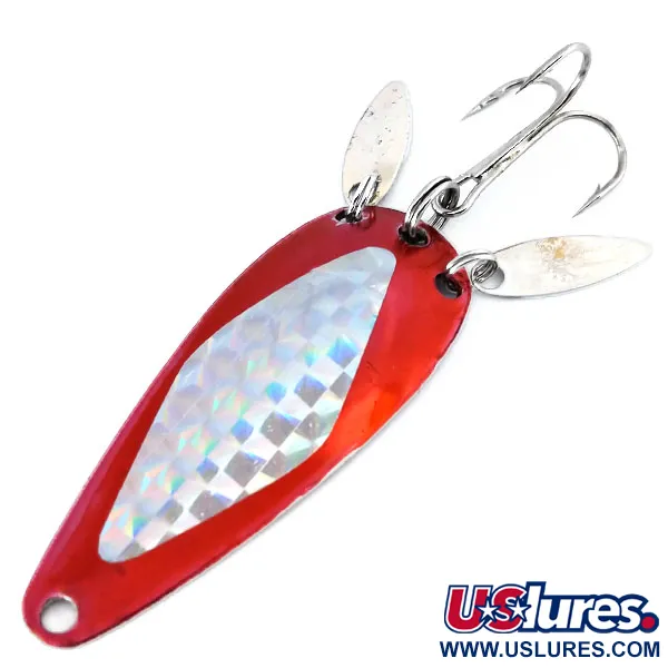 Questo ondulante Marathon presenta un profilo a goccia accentuato da una vivace finitura rossa e un inserto prismatico riflettente. Con una lunghezza di 6 cm (2 1/4") e un peso di 12 g (2/5 oz), l'esca porta l'eredità della Marathon Bait Company, attiva nel Wisconsin dal 1929 al 1979. Sul dorso in nichel lucidato è visibile il marchio inciso «MARATHON». Questo modello specifico, codice prodotto 10363, è caratterizzato da due piccole palette a foglia di salice argentate fissate vicino alla coda. Queste palette ausiliarie forniscono ulteriori bagliori visivi vicino all'ancoretta durante il recupero. Il lato anteriore mostra un nastro olografico con trama a diamante che riflette lo spettro cromatico completo sulla vernice rossa profonda. Tutta la componentistica, inclusi gli anelli spaccati e l'ancoretta argentata, è in condizioni eccellenti (valutazione 5/5). La testa del cucchiaino include un occhiello pre-forato per l'attacco diretto o tramite moschettone.