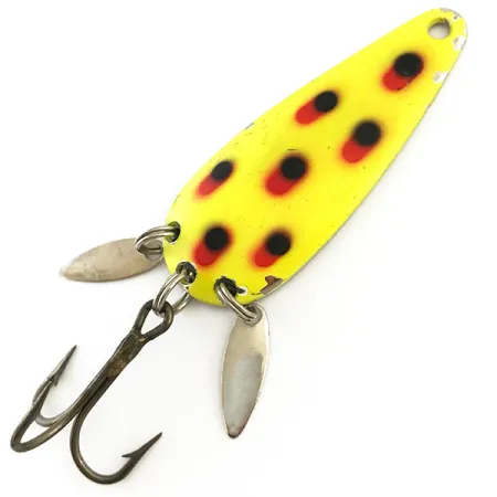 Otto decisi punti neri su accenti rossi punteggiano la faccia giallo vibrante di questo ondulante vintage da lancio. Con una lunghezza di 2 1/4" (6 cm) e un peso di 2/5 oz (12 g), questo esemplare della Marathon Bait Company presenta una disposizione unica di due lamelle sonore con finitura argentata fissate vicino alla coda. Queste piccole lamelle allungate sono progettate per catturare e riflettere la luce proprio dove è posizionata l'affilata ancora. Ruotando l'esca si rivela il classico dorso nichelato, profondamente stampato con il nome "MARATHON" ad arco, marchio di fabbrica del produttore del Wisconsin attivo dal 1929 al 1979. Identificato con il codice 5410, l'ondulante mostra leggeri segni del tempo con lievi segni superficiali vicino all'occhiello e alla coda, ottenendo una valutazione di 4/5. La componentistica, inclusi gli anelli spaccati e l'ancora a finitura scura, rimane robusta e intatta.