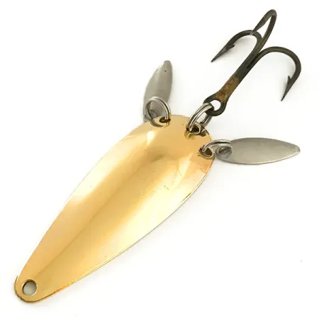 Il metallo dorato costituisce la base di questo cucchiaino ondulante da 6 cm (2 1/4"), un eccellente esempio dell'artigianato americano della metà del secolo. Due palette sonore argentate sono montate sull'anello spaccato posteriore insieme all'amo triplo, progettate per riflettere la luce e fornire stimoli visivi vicino alla zona dell'attacco. Sulla superficie concava interna è chiaramente stampato il nome Marathon, marchio di un'azienda del Wisconsin che ha guidato la produzione di attrezzatura da pesca dello stato dal 1929 al 1979. Questo specifico esemplare, identificato dal codice prodotto 6286, pesa 12 g (2/5 oz) ed è in condizioni 5/5. La struttura presenta un ampio occhiello di attacco in testa, adatto per monofili pesanti o cavetti d'acciaio. La componentistica scura dell'amo triplo crea un forte contrasto con l'oro lucido del corpo dell'ondulante.