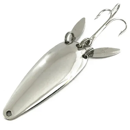 Una nichelatura lucida riveste l'intero corpo da 6 cm (2 1/4") di questo ondulante vintage, un segno distintivo della maestria della Marathon Bait Company durante i suoi cinquant'anni di storia nel Wisconsin. Con un peso di 12 g (2/5 oz), l'esca presenta una configurazione strutturale unica, con due piccole palette sonore a forma di goccia fissate tramite anellini spaccati vicino all'amo. Queste palette ausiliarie hanno un duplice scopo: aggiungere riflessi extra al profilo e mascherare parzialmente la grande ancoretta per imitare meglio l'aspetto di un pesce esca in fuga. Identificato dal codice prodotto 7269, questo modello specifico rappresenta l'ingegnosa progettazione che ha reso Marathon un produttore americano leader tra il 1929 e il 1979. Le condizioni sono un solido 5/5, con superfici metalliche brillanti e dettagli stampati nitidi. Un singolo foro di attacco per la lenza, praticato con precisione all'estremità stretta, completa il design a goccia, ideale per il lancio o la traina in svariate condizioni di acqua dolce.
